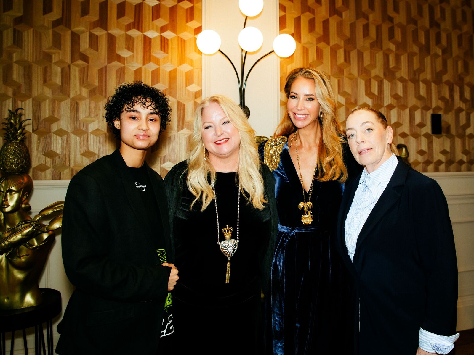 Beeldbijschrift: Links Cody Lauren (choreograaf), linksmidden Nancy Faas (kunstenaar) met het door haar ontwikkelde parfumcollier, rechtsmidden Carolien ter Linden (presentatrice RTL) met het sculptures to wear collier en rechts Lucia Marthas van het Lucia Marthas Institute for Performing Arts.